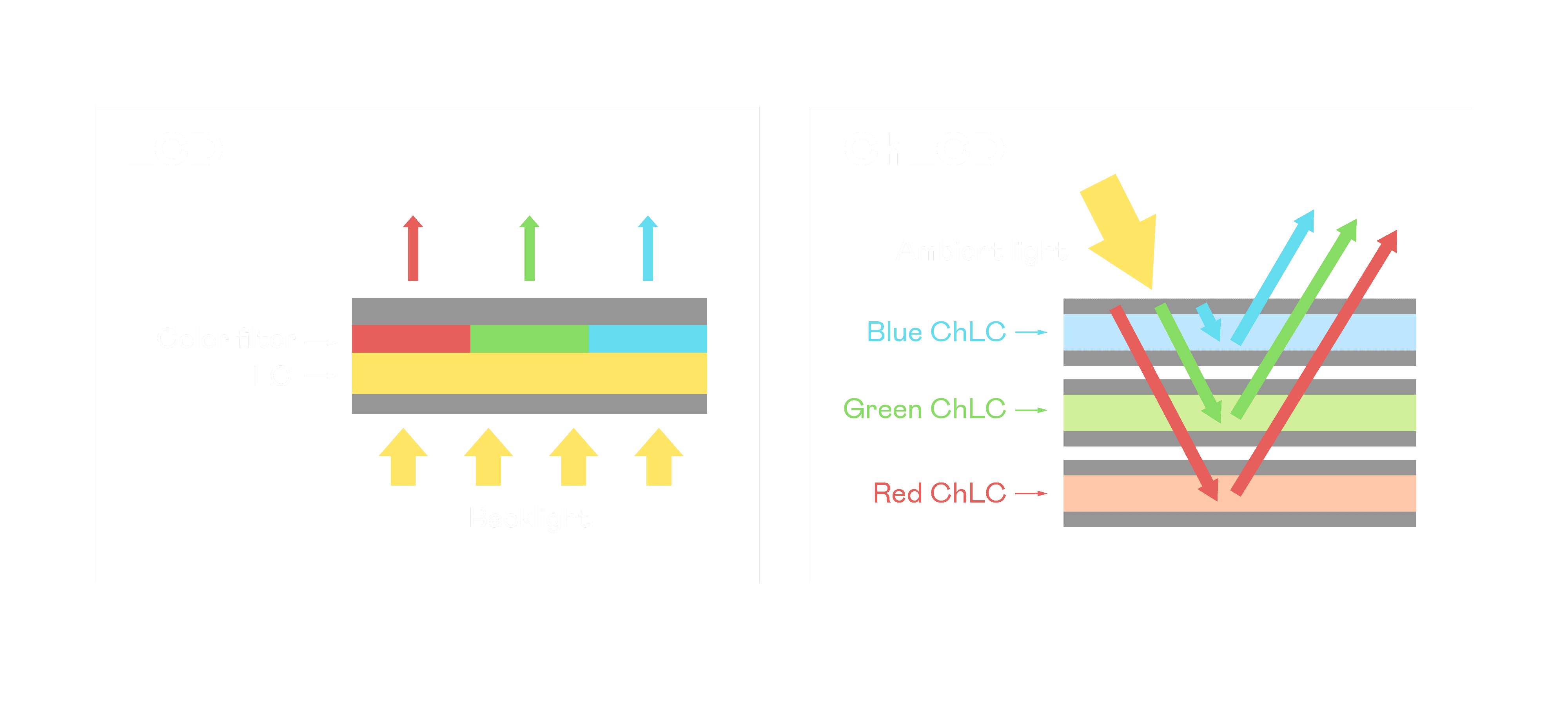 由于超低功耗与媲美平面印刷的色彩表现力,,,加上没有 LED 背光,,长时间阅读,,,眼睛也不易疲累,,所以对电子书阅读器这类产品而言,,胆固醇液晶是电子书阅读器最理想的显示技术选择。。。。